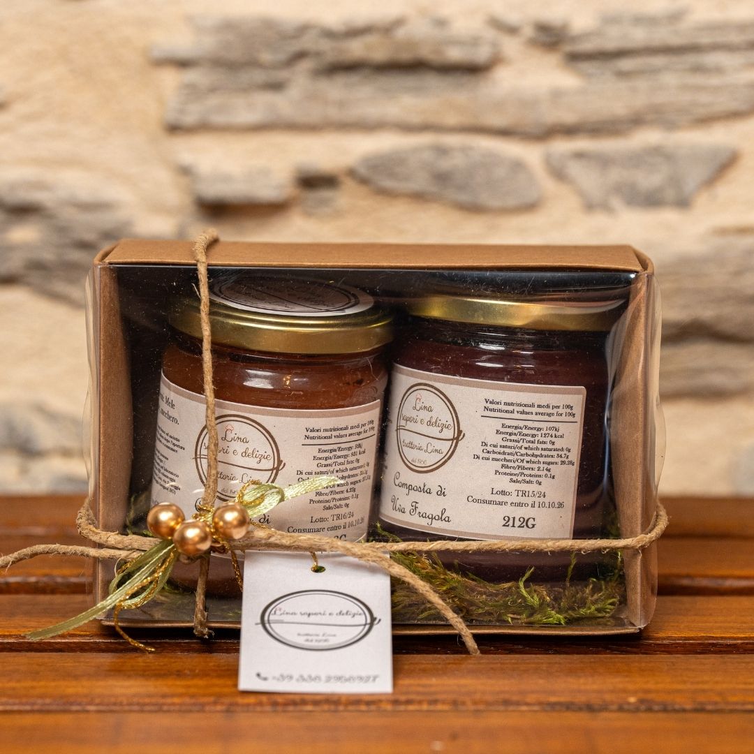 Two 100% fruit compotes , with no added sugar, enclosed in a cardboard box, wrapped in natural string, a sage green silk bow and 3 golden balls.