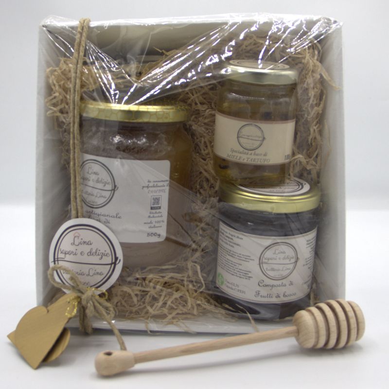 It contains artisanal honey produced with full respect for bees, a fruit compote with no added sugars and an exclusive truffle honey , with a perfectly balanced flavour.