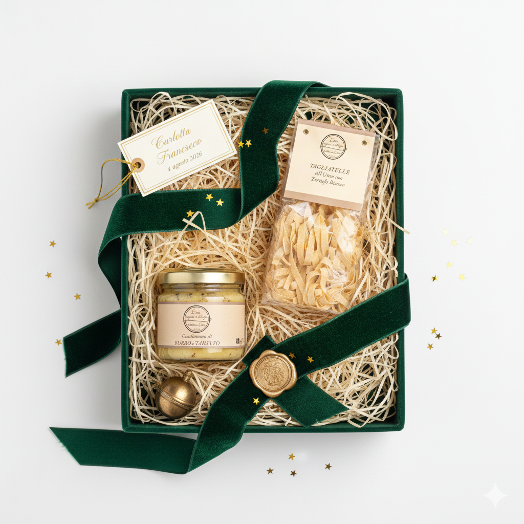 Un set romantico e gourmet: tagliatelle al tartufo + burro al tartufo, confezionati in una scatola elegante.