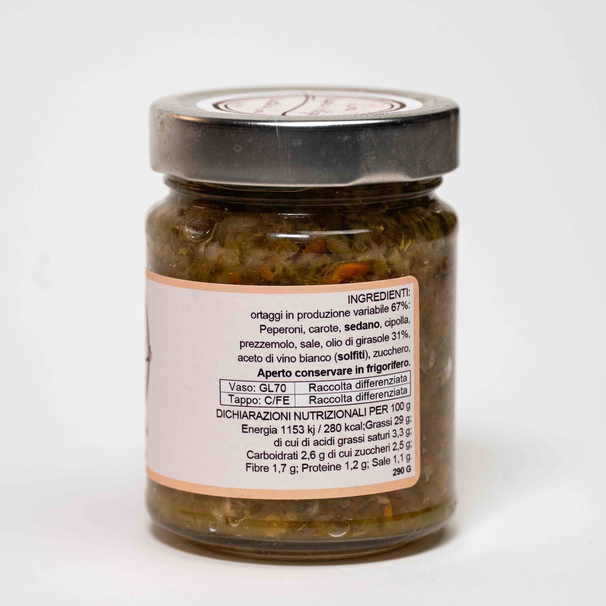 peperoni, carote, sedano, cipolla, prezzemolo, sale, olio di girasole, aceto di vino bianco (solfiti), zucchero